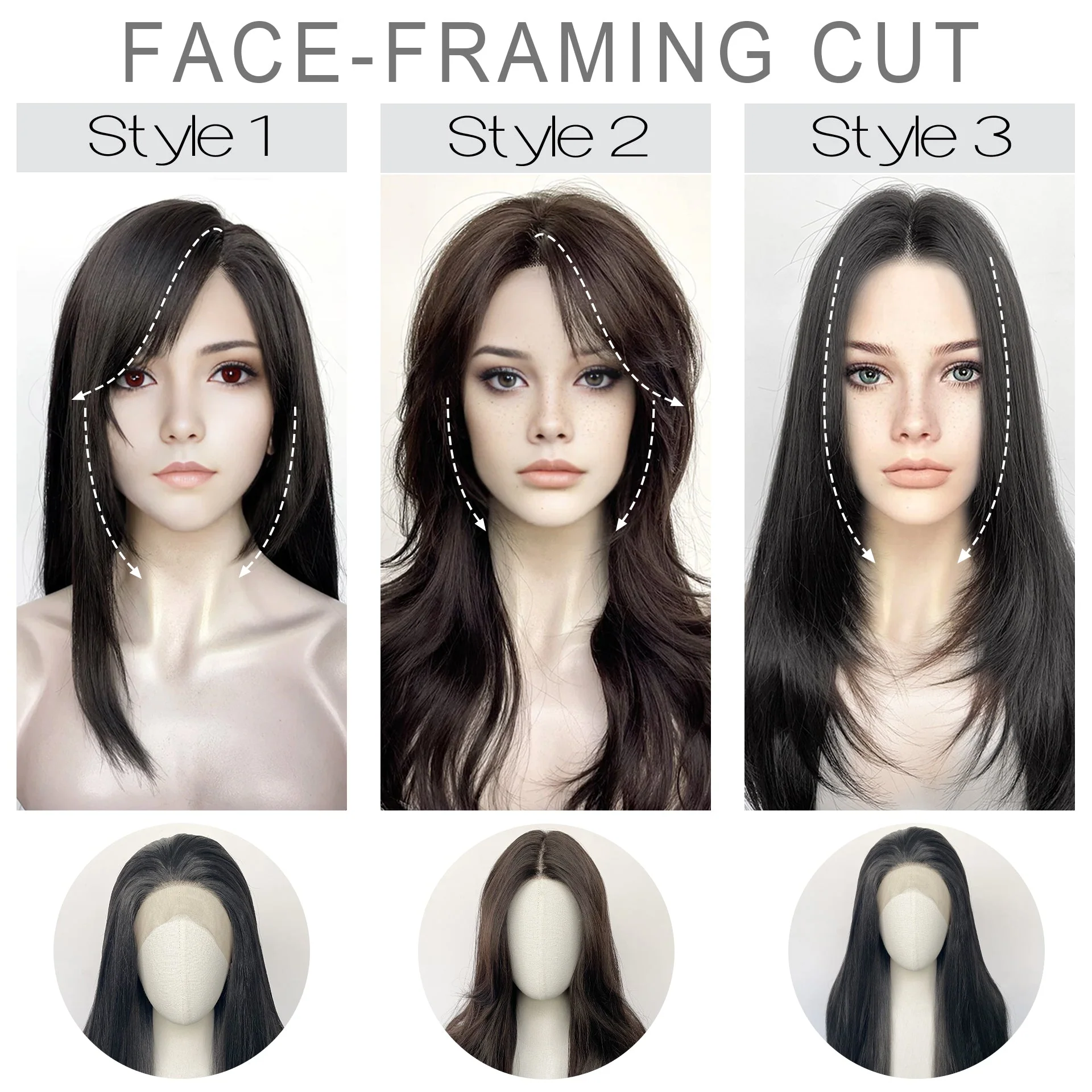 A face-framing cut can enhance the wig's natural appearance and tailor it to your face shape. We offer three different face-framing styles, as illustrated in the gallery photos, to suit your needs.